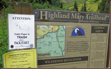 In spite of the these toilet paper signs at every trailhead, we see way too much of it along trails…GROSS & SAD! / We have seen the sheep grazing signs, but have never seen the sheep or dogs. / Entering the wilderness area again. Foot and horse traffic only!
